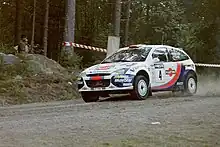 1997 saw the introduction of the Ford Escort WRC, which was now being run by the Cumbria-based M-Sport team, rather than being based at the long term Ford Motorsport home of Boreham. The team continued to be sponsored by Repsol, with a distinctive white and orange livery, and the car featured dramatic changes to the engine, as it was the Escort Group A car's main weak point, and also had several other cosmetic changes including a new front bumper and rear spoiler. On the driver front the team continued to be led by double World Rally champion Carlos Sainz, who drove all fourteen rounds, winning the Acropolis and Indonesia rallies,[20] also often finishing on the podium. He would eventually finish third in the championship. The second seat was initially filled by German driver Armin Schwarz, however, he was replaced after the sixth round in Corsica, following some disappointing results, and the fact that his sponsorship money had not arrived.[14] His understudy was a more than capable Juha Kankkunen, who completed the season in the second car, finishing on the podium on no less than six occasions. A third car was entered at the Network Q RAC Rally for Angelo Medghini.