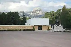 The courtyard of the museum is occupied with tanks and cannons types belonging to different campaign eras and also house a couple of tombstones, brought forth from far away distant campaigns. The back of the Museum, giving on the arms place (French: Place d'armes) of the 1st Foreign Regiment 1er RE, opens on the Monument morts de la Legion, grand sculpture Pourquet (French: Pourquet), representing a world map guarded by four legionnaires and inaugurated in 1931 during the centennial commemoration of the Legion at Sidi bel-Abbès. This entire world map sculpture was entirely demounted to be transported during the move of 1962.
