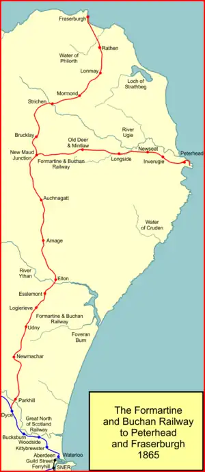 The Formartine and Buchan Railway was a railway company operating in the north-east of Scotland. It was built to link the important fishing ports of Fraserburgh and Peterhead with Aberdeen. It had a junction with the main line of the Great North of Scotland Railway (GNoS) at Dyce. Due to shortage of finance, the line was opened in stages as money became available. The section from Dyce to Mintlaw opened in 1861, and from there to Peterhead in 1862. The Fraserburgh line opened in 1865. The Company was never profitable, and it was heavily supported financially by the GNoSR; it was formally absorbed by that company in 1866.