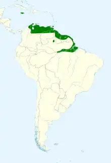 Green-rumped parrotlets are found in tropical South America, from the Caribbean regions of Colombia, Venezuela and Trinidad south and east to the Guianas and Brazil on the lower Amazon River.[10] It has been introduced in Jamaica, Curaçao, Barbados and Tobago, and was not recorded on Trinidad prior to 1916.[8] Along with the lilac-tailed parrotlet (Touit batavicus), they are the only parrotlet species to occur in the West Indies.[11]