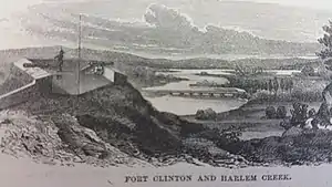 Fort Clinton was a stone-and-earthworks fortification on an elevation within what is now Central Park in New York City. It was built in 1814 near the present line of 107th Street, slightly west of Fifth Avenue. According to maps of the time, Fort Clinton was the easternmost of a connected series of forts, connected to Nutter's Battery on the west by earthworks and a gatehouse over the Old Post Road at the bottom of McGowan's Pass.[2] Fort Clinton and Nutter's Battery were commanded from a third fort at the top of the pass, Fort Fish, which had a sweeping view of Long Island Sound, northern Manhattan, and Westchester County. Fort Fish was across the road from Fort Clinton and connected to Nutter's Battery by another line of earthworks.[3][4]