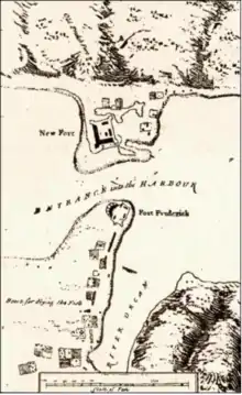 Fort Frederick was a British redoubt that was built to help fortify their acquisition of Placentia in Newfoundland Colony. Under the command of Samuel Gledhill, it served as the military headquarters for Newfoundland from 1721 to 1746. There was a report that the Mi'kmaq were involved in a raid of Placentia during Father Rale's War, in which they were said to have killed 200 English. Governor Drummer did not believe the report.[1]