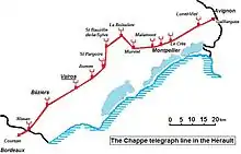 The first semaphore telegraphy line was established in 1794 between Paris and Lille.[2] The French network extended over 5,000 km with 534 stations serving 29 towns. Installed in 1834, the line linking Avignon to Narbonne, via Valros, was functioning until 1853. The semaphore network was then replaced by electric telegraphy. The tours de Chappe (Chappe towers), every 12 km or so, were built on high points. Each station was equipped with a mechanism for transmission and two telescopes to receive a message and to control its onward transmission.[3] The mechanism consisted of a vertical mast supporting a 4.60 m long movable arm, the regulateur. At either end of the latter was a secondary arm, 2 m long, the indicateurs. The mast extended down into the interior of the tower into a tight room, 3 m by 3 m, sheltering the stationnaire, the solitary worker glued to his telescopes. For speed, and confidentiality, messages were encoded using a table where each figure signified a word or phrase. To transmit a message, the regulateur was placed either horizontally or vertically. The indicateurs were articulated every 45o, with 7 positions for each. This gave a total of 98 combinations (7 X 7 X 2), of which six were reserved for the service - the only ones whose meanings were known to the stationnaire. The total repertoire of messages was, therefore, 92 pages of 92 lines, a total of 8,464. Signals were sent in groups of two: the first number for the number of the page, the second for the number of the line on that page.[1]