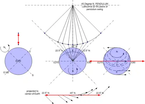 In the examples, the pendulums are of great size to aid in the visualization of the pendulum swing in relation to the Earth (shown as blue circles). The pendulum is drawn so that 90 degrees of pendulum arc sweeps out 90 degrees of arc on the surface of the Earth. Views from the side, the front, and above (right, center, left) are provided to aid in the interpretation of the diagrams and arrows are provided to show the direction of the Earth's rotation. The schematic at the bottom of the each figure represents the range of swing of the pendulum as viewed from above and normalized to a standard orientation. The smaller arrows depict the magnitude of the relative velocity vector for the point on the Earth's surface in-line with the pendulum bob projected to the center of the Earth (the magnitude is shown since the schematic is two-dimensional, not three-dimensional). The pendulum bob is always affected by the force of gravity directed towards the center of the Earth. The force associated with the connection of the pendulum to a support structure directs the pendulum bob along the swing of the arc.