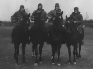 George Strickler, then Rockne's student publicity aide and later sports editor of the Chicago Tribune, made sure the name stuck. He had pitched the idea out loud at the halftime of the Army game in the press box as a tie in to the 1921 Rudolph Valentino movie The Four Horsemen of the Apocalypse.[6] After the team arrived back in South Bend, he posed the four players, dressed in their uniforms, on the backs of four horses from a livery stable in town. The wire services picked up the now-famous photo, and the legendary status of the Four Horsemen was assured.[6]