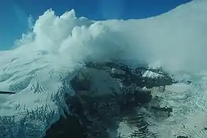 Headwall of Fourpeaked Glacier with steam and volcanic gases rising through vents on Sept. 20, 2006