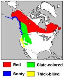 The review by Zink & Weckstein (2003),[6] which added mtDNA cytochrome b, NADH dehydrogenase subunit 2 and 3, and D-loop sequence, confirmed the four "subspecies groups"[7] of the fox sparrow that were outlined by the initial limited mtDNA haplotype comparison (Zink 1994).[8] These should probably be recognized as separate species, but this was deferred for further analysis of hybridization. Particularly the contact zones between the slate-colored and thick-billed fox sparrows which are only weakly distinct morphologically were of interest; the other groups were found to be distinct far earlier.[9] A further study of the nuclear genome, using microsatellites, showed similar separation between the four groups.[10]