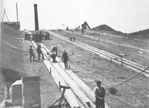 The plane was designed by Gordon Cale Thomas, after a large-scale prototype was built at the company's Bulbourne yard and he had assessed the 75 ft (23 m) climb.[2] It had two tanks, or caissons, each capable of holding two narrowboats or a barge. The water-holding caissons balanced each other. The caissons' vertical guillotine gates created a watertight seal.[2] The lift was powered by a 25-horsepower (19 kW) stationary steam engine. The land for the plane was purchased for £1,595 and total expenses for the project came to £39,244 by 24 June 1900.[3]