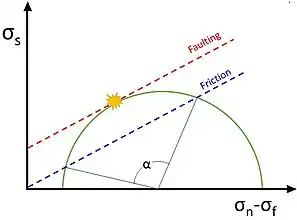 2D Mohr's diagram showing the different failure criteria for frictional sliding vs faulting. Existing cracks orientated between -α/4 and +α/4 on the Mohr's diagram will slip before a new fault is created on the surface indicated by the yellow star.