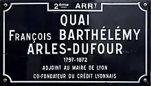 François Barthélemy Arlès-Dufour died on 21 January 1872, in Vallauris, Alpes-Maritimes.[1] In his obituary the Journal de Lyon wrote, "He made his life into two parts, one was industry and the other was humanity". Michel Chevalier said of him that few French people were so well known abroad. He had received decorations from Austria, Bavaria, Denmark, Prussia, Sardinia, Saxony, Sweden and Tuscany.[1] He was a Commander of the Legion of Honour and a member of the L’Académie des Sciences, Belles-Lettres et Arts de Lyon.[2] His firm lasted until 2013, called in turn Chabrières-Morel from 1885, then Morel-Journel & Cie from 1930.[3]