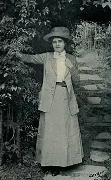 Wolseley received a private education, which was erratic due to the itinerant lifestyle resulting from her father's career.[2] Wolseley wrote that it never occurred to her that she "could ask to be educated with a view to having ultimately a profession, for instinctively I knew that my education was conducted with a view to one end—that of becoming a capable wife of a rich man”.[5] Though not a supporter of women's suffrage or emancipation, Wolseley's father was aware of the emerging career opportunities for women and wanted her to be capable of taking an active role in the society. To prepare her and some of her friends for public speaking, he founded a Girls' Debating Society in the late 1880s.[6] Wolseley's first social season in 1891 won her popularity and praise for her fashion sense.[7]