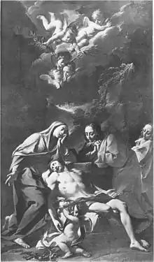 His first known work, dating from 1713, is a Pentecost for the Basilica of San Prospero in Reggio Emilia. Other early works include a Rape of the Sabines for Count Ranuzzi and a Triumph of Mordecai for the court at Turin.[2][3] Around this time, he was commissioned, along with other painters, to provide decorations for the Duke of Richmond's Goodwood Palace. He also executed commissions for a number of churches in Bolognia.[2] Within a few years, he was admitted to the prestigious Accademia Clementina.