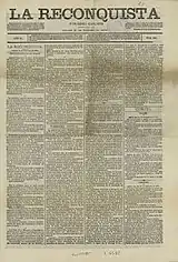 In the late 1860s Melgar, from his youth demonstrating impressive ease of writing, commenced co-operation with a number of Madrid right-wing periodicals[44] and befriended Traditionalist pundits of the era, like Francisco Navarro Villoslada, Antonio Juan de Vildósola and Candido Nocedal;[45] with Antonio Aparisi Guijarro he was even distantly related.[46] Formally member of the editorial board of El Pensamiento Español,[47] in 1871 he became key staff member of La Reconquista.[48] Upon the 1872 outbreak of the Third Carlist War Melgar became editor-in-chief of the paper;[49] increasingly endangered by Republican hit-squads dubbed "partido de la porra", he went into hiding.[50] In 1873 he took part in gathering of Carlist press leaders in Bordeaux, where Melgar met the claimant for the first time.[51] Having returned to Madrid he went on editing La Reconquista until it became impossible, in 1874 leaving by sea[52] for the Carlist zone.[53]