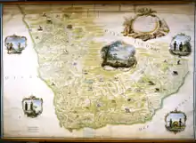 An illustrative map of his travels was produced around 1790 for King Louis XVI. Measuring nine feet wide and six feet high, the map depicts the travels and the landscape met with. The cartographic elements of the map were made by Perrier with the insets of animals and landscapes by Van Leen. The birds were by Reinold. Sixty two pictures of fauna and flora were stuck onto the map. One of the animals depicted is the now extinct bluebuck.[3]