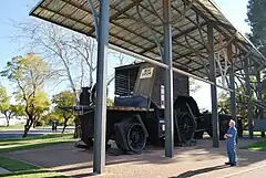 Big Lizzie stood idle for many years. The Blackstone engine was sold in 1938, powered stone crushing equipment at Pyramid Hill until 1942 and was scrapped in 1945.[9] Big Lizzie was recovered and brought to Red Cliffs in 1971. She is now displayed in Barclay Square on the Calder Highway. Visitors may listen to a recording that tells the history of the machine.[10]