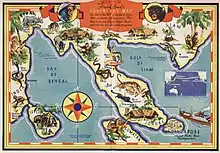 A brochure for the Pepsodent-sponsored Frank Buck Adventurer's Club, held in the Hanna Holborn Gray Special Collections Research Center at the University of Chicago Library includes a map with the locations of four camps with the note that the map is meant to help the reader "follow Frank Buck's adventures over his radio program." The map marks Singapore as Buck's "headquarters" with another camp in Johore, and a second near Siam (now Thailand), and a third in approximately Burma (now Myanmar) near the Bay of Bengal.[76]