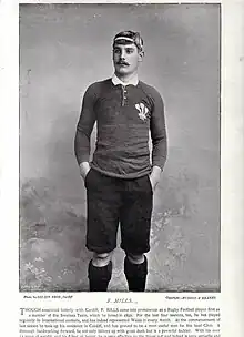 Mills was reselected for the 1894 Home Nations Championship, but a mixture of poor pitch conditions and Welsh in-fighting resulted in two loses and just a single win. At the end of the 1894 season, Mills is recorded playing at least one match for Glamorgan, alongside Swansea team-mate Billy Bancroft.[3] The next season Mills had switched clubs from the Whites of Swansea to the Blues of Cardiff, but retained his position in the Welsh squad. By playing in all three games of the 1895 Championship Mills had represented Wales in 12 consecutive international games, and his final game for Wales was the opening match of the 1896 tournament, which saw England run seven tries passed the Welsh without reply. The Welsh selectors lost faith in the pack, bringing in five new caps for the next game. Mills was one of those players replaced and never represented Wales again.