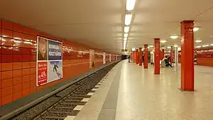 Originally the station was red, however it was changed to orange in the restoration of the station in the 1980s. After a second restoration in the 2004 the red colour was restored with new wall tiles. A lift was added between the platform and the level immediately under the street (leaving one flight of stairs to be navigated) and there is direct access from this level to the neighbouring Ring-Centre shopping centre.