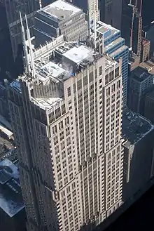 Designed by Adrian D. Smith of Skidmore, Owings & Merrill, the Franklin Center is one of the most famous and recognized buildings in Chicago.[5] The building's form features setbacks at the 15th, 30th and 45th floors. Designed in the postmodern architectural style, it is a granite-clad steel-framed building resting on pile foundations.[6] The structure is characterized by strong vertical lines, spiked roof pinnacles, granite cladding and setbacks. The granite is a deep red color at the base, but changes shade to rose-beige at the top.[12] Above the 5th floor, the lighter rose-beige granite is protected by silk-screened aluminum panels.[4] The building relies on Gothic detailing to showcase verticality. The building's verticality evokes images of 1920s buildings, and the sturdiness of the structure is reminiscent of the Chicago Board of Trade Building.[10] In addition to its design, the building relies on its location at the farthest corner from the Willis Tower to set it apart.[10]