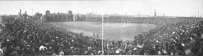 Franklin Field was built for US$100,000 (equivalent to $3,517,600 in 2022) and dedicated on April 20, 1895, for the first running of the Penn Relays.[6] The Field supplemented and eventually replaced the venue called University Grounds, which was located a few blocks west on a block bounded by Spruce Street (north), 38th Street (east), Pine Street (south), Woodland Avenue and 37th Street T-intersection (northwest). Its location was typically given as "37th and Spruce".[7]