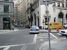 The Tontine Crescent and the other houses in Franklin Place were acquired by the city "for the public convenience"[23] and razed in 1858 to make way for blocks of large stone stores and granite warehouses in Franklin Street.[37] These buildings, along with a single elm remaining from the garden (plus three empty circular pits that once held trees), were destroyed in the Great Boston Fire of 1872.[38] The graceful curve and unusual width of Franklin Street today below Hawley Street are reflections of the Crescent's ground plan. Architectural descendants include the Sears Crescent near today's Boston City Hall and the façade of the Kirstein Business Branch of the Boston Public Library (built 192930), which replicates the entire central portion of the Tontine. Despite residents' general aversion to connected structures, hundreds of brick row houses in the area draw inspiration from the Bulfinch structure, including Worcester and Chester Squares in the South End; West Hill Place and Charles River Square on Beacon Hill; a set of fifteen attached brick and half-timbered town houses on Elm Hill Avenue in Roxbury Highlands originally called Harris Wood Crescent; and a block of fifteen red-brick connected houses on Beacon Street in Brookline, built in 1907.[39]