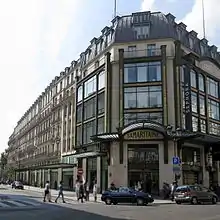 La Semeuse de Paris was built between 1910 and 1912 to house the credit department of La Samaritaine department stores for lending to the poorest customers. The art nouveau building also contained apartments. It was listed as a historical monument on 11 December 2000.[9] In 1925 Cognacq was authorized to construct a second building. Jourdain and Henri Sauvage began work in January 1926, and completed it in September 1928 after many changes from the original plan. At the request of the prefecture the steel frame was given a cream-colored stone exterior. Jourdain built Store 3 on the lot bounded by the rues de Rivoli, Pont-Neuf and Boucher between 1930 and 1933. The interior is best preserved in Store 2, with a glass roof, wide staircases and characteristic bright blue, green and orange colors.[7]