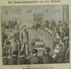 The trial began on January 26, 1892. During the proceedings, Franz Schneider openly admitted to the murders, appearing seemingly unfazed and jovial throughout the trial proceedings. Prosecutors claimed that Rosalie had been an active participant, holding down some of the victims' hands to prevent her husband from being scratched on the face. Multiple witnesses and acquaintances were questioned on the stand, including the surviving victims, all of whom either testified against the Schneiders or claimed that they found some of their activities to strange but did not pry any further.[6] At some point during the proceedings, the spouses started pinning the blame solely on one another, leading them to refuse to talk to one another altogether. The trial became a sensation in contemporary Viennese society, with numerous people following the news or attending the hearings just so they could learn more about the Schneiders' crimes.[7] Comparisons were drawn between them and another serial killer, Hugo Schenk, who had committed similar murders with two accomplices less than a decade prior.