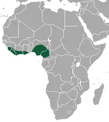 Fraser's musk shrew is native to tropical western and central Africa. Its range extends from Guinea, Sierra Leone and Liberia through Ivory Coast, Ghana and Nigeria to Cameroon. Its range may extend further to the east than Cameroon because there is some confusion between its range and that of the very similar Bates's shrew (Crocidura batesi), a species which is found in Cameroon, Republic of the Congo, Equatorial Guinea and Gabon. Fraser's musk shrew is also present on the islands of São Tomé and Príncipe, located in the Gulf of Guinea. Its altitudinal range is between sea level and a few hundred metres. It typically occurs in primary forest and forest remnants, but has also been recorded from grasslands, grass clearings, savannah and farm bush.[1]