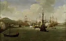 Duquesne sends an emissary, M. de Saint-Amand, to summon the pacha commanding in Chios to send out the corsairs, under penalty of destruction of the port and the fortresses, which he refuses.[7] On July 23, 1681, Duquesne ordered the ships of his squadron to bombard the city and the port. The French fire was so vigorous that in less than four hours the Barbary fleet, the fortresses and the port were badly damaged. A Turkish account of the time recounts this attack: "The French infidels came to Scio, they fired for four hours on the vessels of Tripoli Barbary, they also damaged the fortresses and the mosques. "Many Greeks are among the victims because they are the majority on the island. Several Orthodox churches are affected."[8]