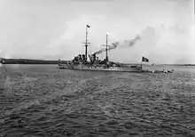 Courbet was ordered on 11 August 1910[8] and named after Admiral Amédée Courbet.[9] She was laid down on 1 September 1910 at the Arsenal de Lorient and launched on 23 September 1911. Shortly after finishing her machinery trials, she ferried the President of France, Raymond Poincaré, to Britain for a short visit on 24–26 June 1913. Courbet was completed on 8 October at a cost of F57,700,000 and was commissioned into the fleet on 19 November. Courbet and her sister Jean Bart were assigned to the 1st Battle Division (1ère Division de ligne) of the 1st Battle Squadron (1ère Escadre de ligne) of the 1st Naval Army (1ère Armée Navale), at Toulon in mid-November and Courbet became the flagship of Vice-Admiral (Vice-amiral) Augustin Boué de Lapeyrère, commander of the 1st Battle Squadron, on 5 January 1914.[10]