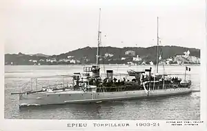 When the First World War began in August 1914, Épiue was assigned to the 3rd Destroyer Flotilla (3e escadrille de torpilleurs) of the 2nd Light Squadron (2e escadre légère)[5] based at Cherbourg.[4]