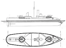 Furieux was designed in the late 1870s as part of a naval construction program that had begun under the post-Franco-Prussian War fleet plan of 1872. Initially, the French built two types of armored capital ships, the first, a series of high-freeboard barbette ships, and the second being smaller coast defense ships descended from the monitors that had been built in the 1860s.[1] Most of the initial series of coastal defense ships built under the 1872 plan featured a single gun turret with two large-caliber guns toward the bow similar to the breastwork monitors being built in the British Royal Navy at the time. The French ships included the four vessels of the Tonnerre and Tempête classes, which being built simultaneously in the early 1870s and were broadly similar. Their turrets were very large, with the guns widely spaced, to theoretically allow them to fire directly astern, one gun on either side of the superstructure. The Minister of the Navy, Louis Raymond de Montaignac de Chauvance, ordered a fifth vessel on 12 February 1875, to be named Furieux, nearly identical to Tonnerre, though with a slightly longer and narrower hull.[2]
