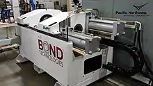 In principle, friction extrusion can be performed on any machine which can produce the required rotary and linear motions between the die and charge. Examples include machines built for friction stir welding, milling machines modified to accommodate the extrusion forces, and purpose built friction extrusion equipment such as the shear assisted processing and extrusion (ShAPE™) machine at the Pacific Northwest National Laboratory. Figures 1-3 show examples of friction extrusion equipment and extruded products. Figure 4 shows typical friction extrusion dies designed for production of wire, rod and tube. Dies are rotated in the direction which enhances material flow toward the extrusion orifice during the process.