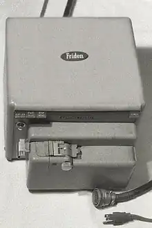 The Friden Flexowriter produced by the Friden Calculating Machine Company, was a teleprinter, a heavy-duty electric typewriter capable of being driven not only by a human typing, but also automatically by several methods, including direct attachment to a computer and by use of paper tape.