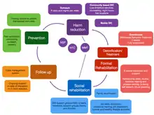 FI's Drug Project (initiated in 1998) is one of the only holistic approaches for drug using youth in Cambodia.[10] It provides a set of prevention and harm reduction services to drug using street children and youth as well as services to help them recover from addictions and return to normal life through rehabilitation with family/school reintegration, and training and job placement. The Drug Project was the first established in Cambodia to respond to the growing need for drug programs specifically targeting street youth. Currently FI is one of only three organizations in Cambodia licensed by the government to implement needle and syringe exchange programs.[11] In 2013, 150 children/youth went through voluntary detoxification and 100,000 clean syringes were provided to drug users to prevent the spread of infectious diseases.[12]