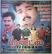 Friends is a 2001 Indian Tamil-language buddy drama film, directed by Siddique and produced by Appachan. It is a remake of Siddique's 1999 Malayalam film of the same name. The film stars Vijay, Suriya and Ramesh Khanna in the lead roles, while Devayani, Vijayalakshmi, Abhinayashree, Sriman, Vadivelu, Charle, and Radha Ravi play supporting roles. The music was composed by Ilaiyaraaja, while Anandakuttan handled cinematography.