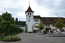 Yard of Frienisberg nursing home with the tower of the former abbey.
