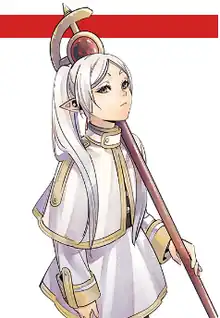 Frieren (Japanese: フリーレン, Hepburn: Furīren) is the title character and protagonist of the Japanese manga series Frieren: Beyond Journey's End, written by Kanehito Yamada and illustrated by Tsukasa Abe. Frieren is a former member of the party of adventurers who defeated the Demon King and restored harmony to the world after a ten-year quest. Frieren returns to the capital fifty years later; however, humanity has changed, and her former companions have distinctly aged. After one last adventure to see a meteor shower, Himmel dies of old age. During the funeral, Frieren expressed guilt for not attempting to learn more about him. Frieren then pays a visit to her other former comrades. She accepts an offer to teach and care for Fern, an orphaned child adopted by Heiter. She also receives an invitation to travel far north, to the resting place of souls, and see Himmel again to bid the hero a fitting farewell and express her feelings. To fulfill those requests, Frieren embarks on a journey together with Fern while still pursuing her passion for learning magic.