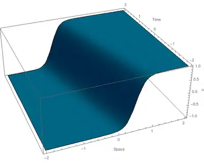 The most simple example of front solution connecting a homogeneous stable state with a homogeneous unstable state can be shown in the one-dimensional Fisher–Kolmogorov equation: