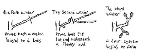 - Spur pruning: Spur bearing varieties form spurs naturally, but spur growth can also be induced.