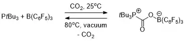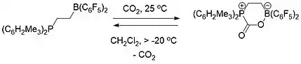 FLP chemistry is conceptually relevant to carbon capture.[19] Both an intermolecular (Scheme 1) and intramolecular (Scheme 2) FLP consisting of a phosphine and a borane were used to selectively capture and release carbon dioxide. When a solution of the FLP was covered by an atmosphere of CO2 at room temperature, the FLP-CO2 compound immediately precipitated as a white solid.[19][20]