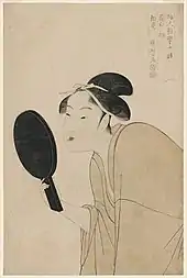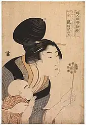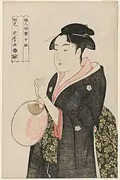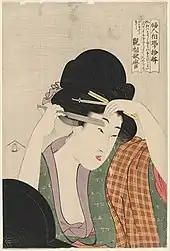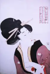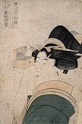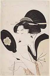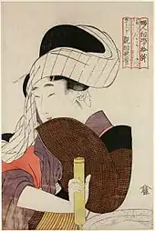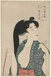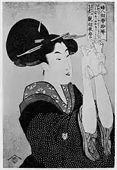 Kitagawa Utamaro (c. 1753–1806) made his name in the 1790s with his bijin ōkubi-e ("large-headed pictures of beautiful women") portraits, focusing on the head and upper torso, a style others had previously employed in portraits of kabuki actors.[4] Utamaro experimented with line, colour, and printing techniques to bring out subtle differences in the features, expressions, and backdrops of subjects from a wide variety of class and background. Utamaro's individuated beauties were in sharp contrast to the stereotyped, idealized images that had been the norm.[5]