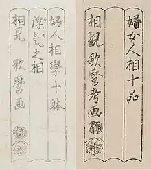 It is assumed the words 相見 and 相観 are read sōmi and that they refer to a person who reads physionomies, thus the signature can translate as.[8] This has to do with Sōgaku, a pseudoscience by which it was believed an analysis of facial features ("physignomy") could reveal personality traits. Texts were published at the time on these analyses. Utamaro's analyses were not based on these observations, but rather on allusions to other books, such as the illustrated story by Santō Kyōden of a prostitute disguised as a dancer, and an erotic book illustrated by Utamaro and Katsukawa Shunchō called Ehon Hime Hajime (会本妃女始, "Picture Book: First-Time Princesses", 1790), in which facial types are compared to the aspects of the sexual organs. Viewers likely were aware of the allusions of the prints to these books.[9]