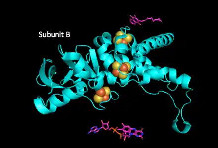 To date, a number of QFR enzymes have been crystalized and the specifics of enzyme structure varies between organisms; however, the overall structure remains similar across different species.[1][7][8] Fumarate reductase complexes include four subunits.[1] Subunit A contains the site of fumarate reduction and a covalently bound flavin adenine dinucleotide (FAD) prosthetic group. It is closely bound to subunit B, which contains three iron-sulfur centers, all placed near to each other and the nearby substrates. Subunit C consists of hydrophobic membrane-spanning, primarily helical segments and is the site of quinol oxidization. In some fumarate reductase structures, one or more heme groups are additionally bound to the C subunit and participate in the electron transfer.[7][5] The D subunit contains hydrophobic alpha helices that span the membrane, but does not participate in the catalytic action of the enzyme. It may be required to anchor the catalytic components of the fumarate reductase complex to the cytoplasmic membrane.[5]