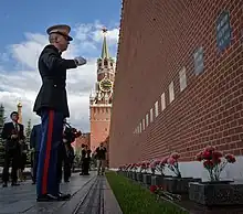 The funerary procession stopped near the Lenin Mausoleum, where a military band was standing. Near the Mausoleum, the funerary urns were put on special pedestals and the burial ceremony began. At 14:30, the chairman of the government funeral commission, Andrei Kirilenko, placed the urns in the niches of the Kremlin Wall Necropolis.[1] A moment of silence was declared throughout the Soviet Union, after which a gun salute was fired and the niches were sealed.[1] The anthem of the Soviet Union was played, then the military marched past the Mausoleum.[1]