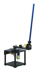 The Furuta pendulum, or rotational inverted pendulum, consists of a driven arm which rotates in the horizontal plane and a pendulum attached to that arm which is free to rotate in the vertical plane. It was invented in 1992 at Tokyo Institute of Technology by Katsuhisa Furuta[1][2][3][4] and his colleagues. It is an example of a complex nonlinear oscillator of interest in control system theory. The pendulum is underactuated and extremely non-linear due to the gravitational forces and the coupling arising from the Coriolis and centripetal forces. Since then, dozens, possibly hundreds of papers and theses have used the system to demonstrate linear and non-linear control laws.[5][6][7] The system has also been the subject of two texts.[8][9]