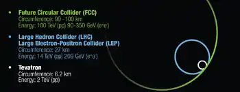 The Future Circular Collider (FCC) is a proposed particle accelerator with an energy significantly above that of previous circular colliders, such as the Super Proton Synchrotron, the Tevatron, and the Large Hadron Collider (LHC).[1][2] The FCC project is considering three scenarios for collision types: FCC-hh, for hadron-hadron collisions, including proton-proton and heavy ion collisions, FCC-ee, for electron-positron collisions, and FCC-eh, for electron-hadron collisions.[3]