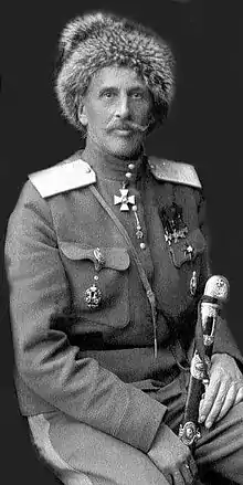 From April 3, 1915, he was the commander of the 3rd cavalry corps.[8] During the offensive at the end of April 1915, he distinguished himself with a successful cavalry attack at Balamutovka and Rzhaventsy, breaking through Austrian fortifications, taking strategically important heights and many prisoners.[3]