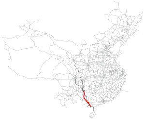 The expressway starts in Wudang District, Guiyang, and passes through Qiannan Buyei and Miao Autonomous Prefecture, Hechi, Nanning and Qinzhou before terminating in Haicheng District, Beihai.[4][5][6]