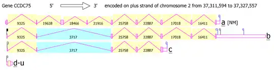 This figure depicts the transcript variants of GPATCH11 and was obtained from NCBI Aceview.[8] Transcripts a and b have known functioning proteins.